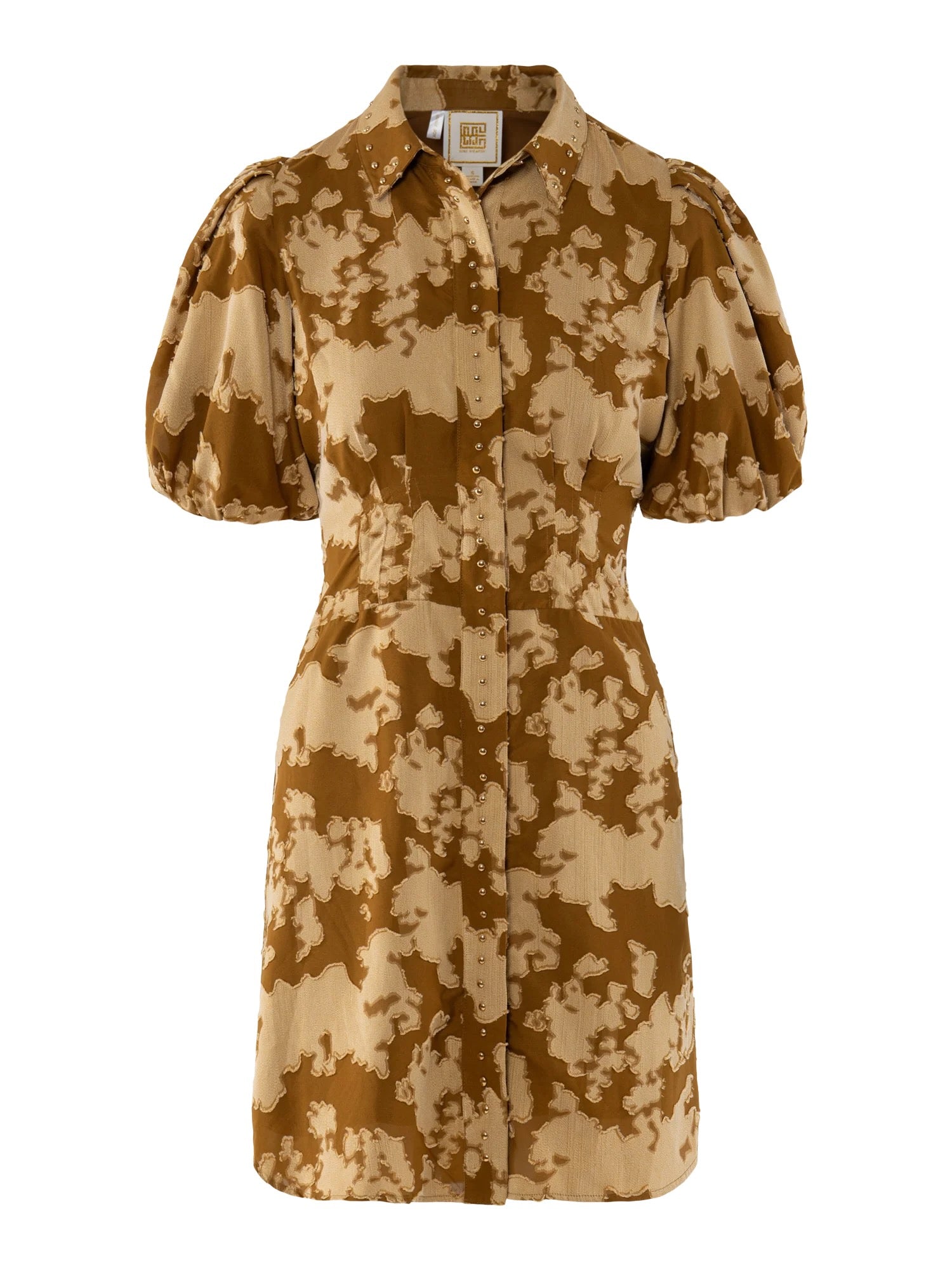 The Britt Dress in Hide showcases a tailored yet versatile silhouette with a classic fold collar accented by gold studs, elastic puff sleeves, and a lightly boned bodice for structure. The front button closure is concealed with a studded panel, flowing into a curved shirttail hem that enhances movement and shape. The hide print mimics the rich dimension of cowhide with a modern, elevated twist, finished with a subtle sheen that adds a touch of feminine flair. Designed to flatter, this style also features shaping seams through the waist for a defined fit.