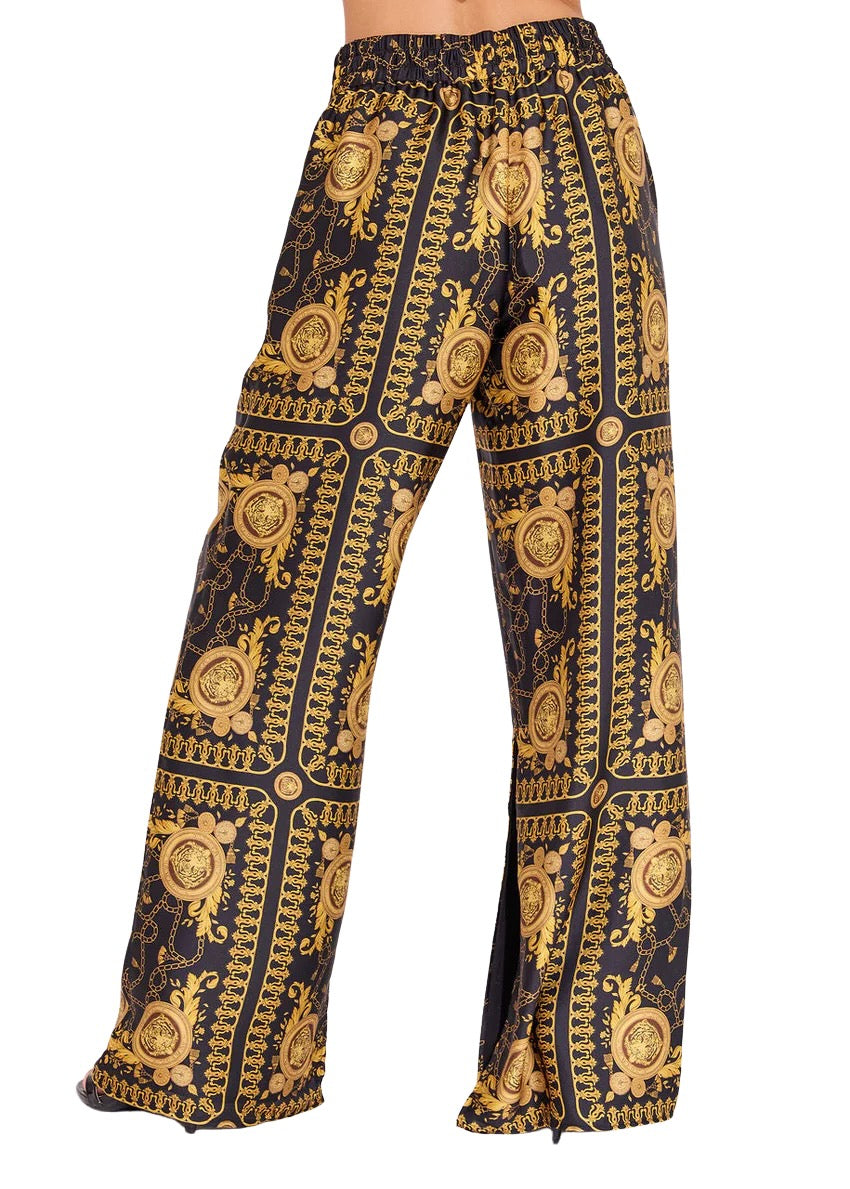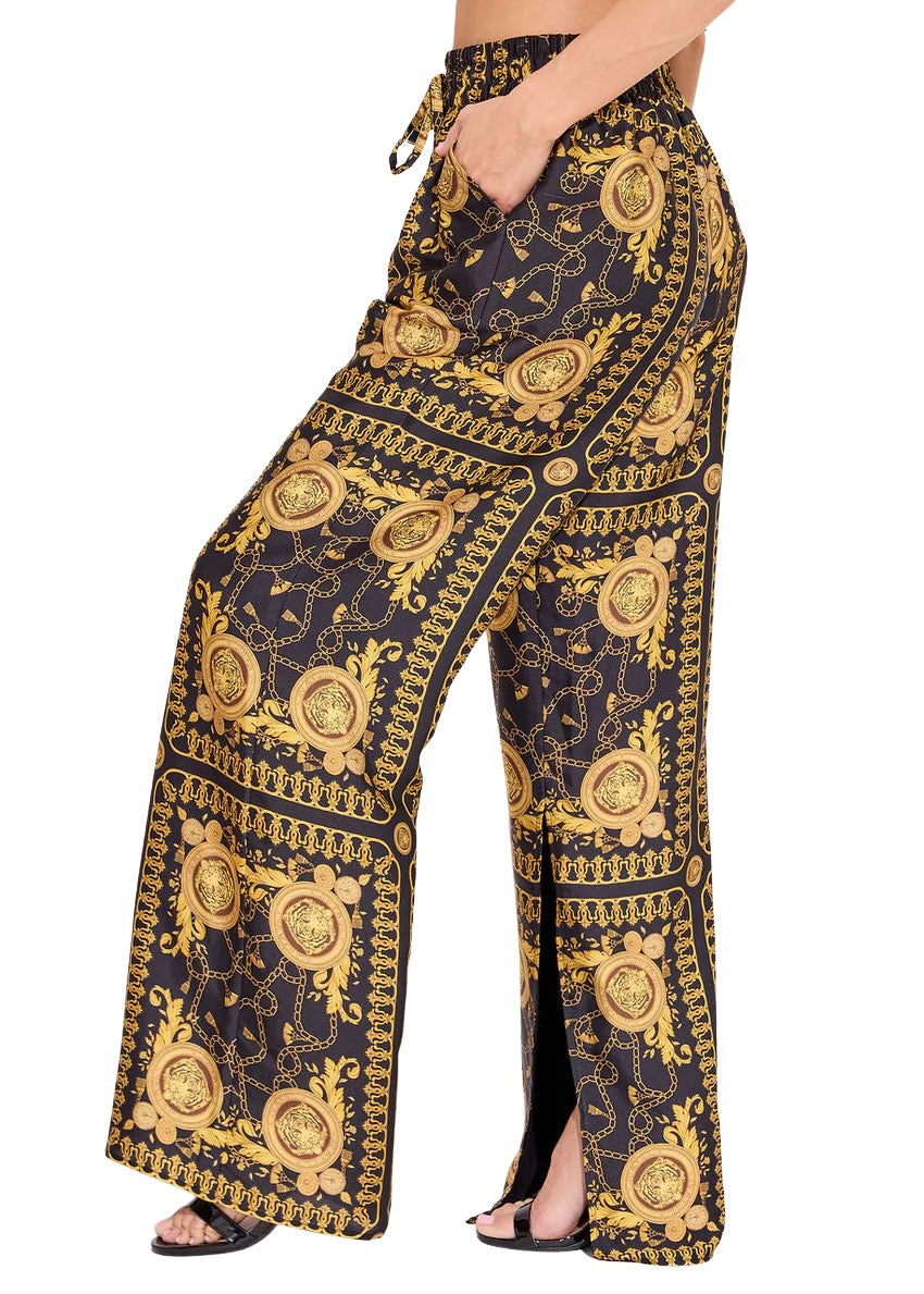 The Penny Pant is back in this season's new print donatellot! The Penny is a pull-on drawstring pant with side slits and an elastic waist.