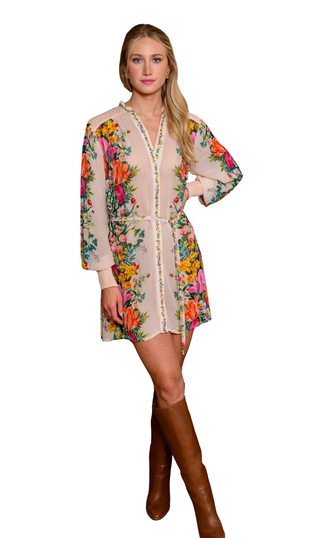 Tara is about to be the style of the season! Her easy wear, button down silhouette features a covered placket, balloon sleeves, and a cord belt cut from a stunning ivory floral print. Separate ivory slip included.