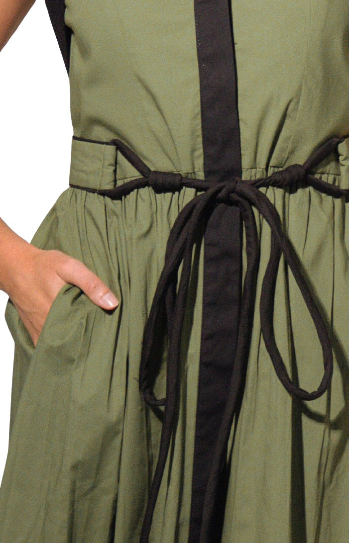 FIT. Sleeveless midi dress, with hidden button placket and adjustable belt. Ruffle details on the skirt.